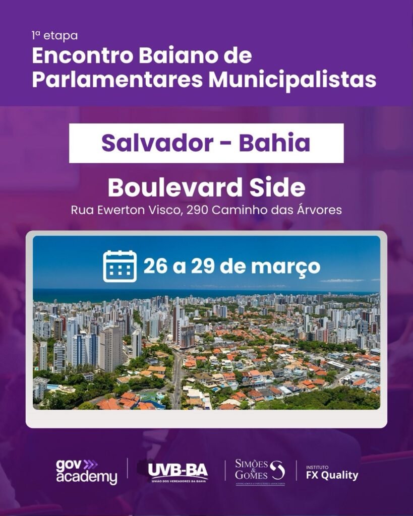 O evento é promovido pela União de Vereadores da Bahia em parceria com o GovAcademy, apoio da Simões e Gomes Advogados Associados e o Instituto FX Quality e abordará temas como: Processo Legislativo Municipal, Contratações Públicas, Oratória, Comunicação, Fiscalização de Obras e Gestão de Recursos Públicos e Emendas Impositivas.