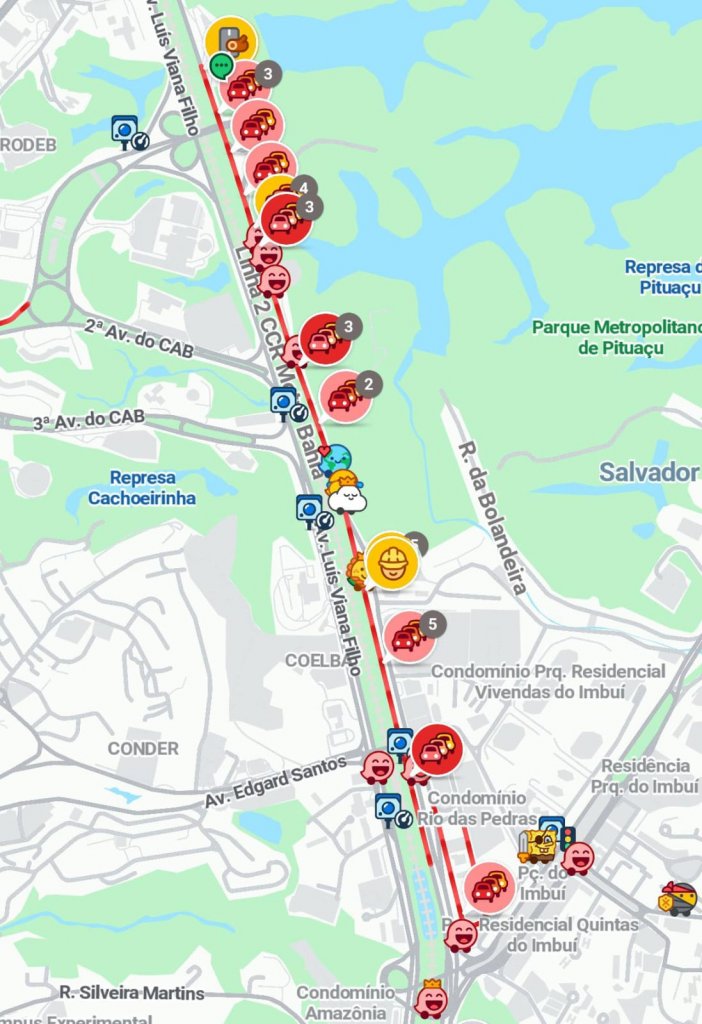 Conforme o Waze, o engarrafamento se estende até as proximidades do Imbuí. Confira:
